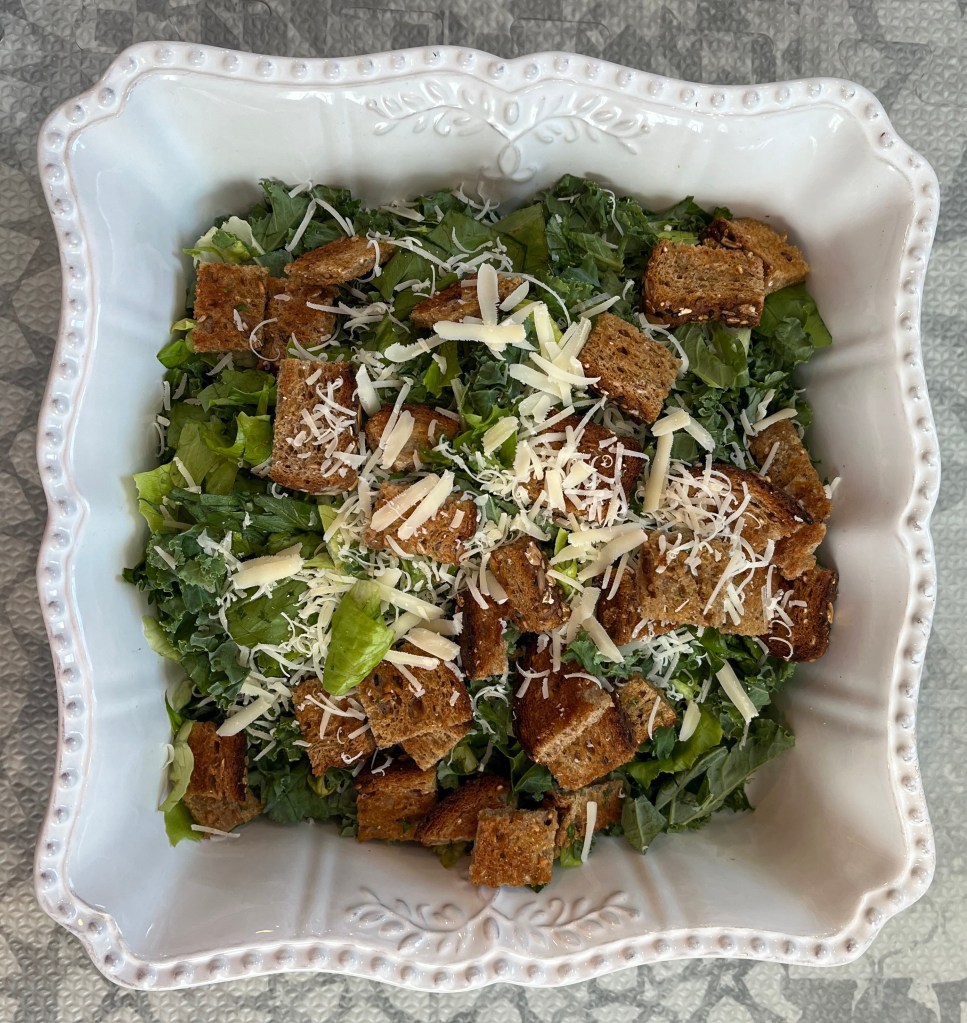 I find myself craving a Kale Caesar Salad from a popular salad franchise often. I realized it is quite easy to make at home with homemade dressing and croutons.